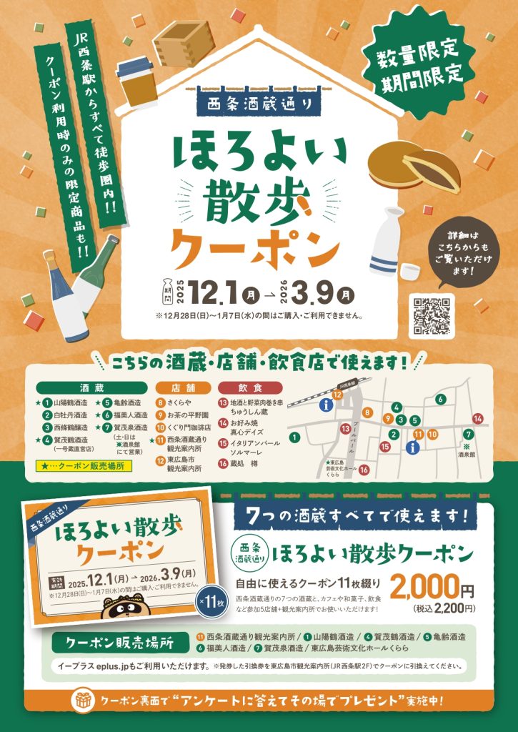東広島市の西条酒蔵通りにて、お酒を飲みたい人も飲めない人も、いつもよりお得に楽しめる数量限定・期間限定の「ほろよい散歩クーポン」が販売されます!